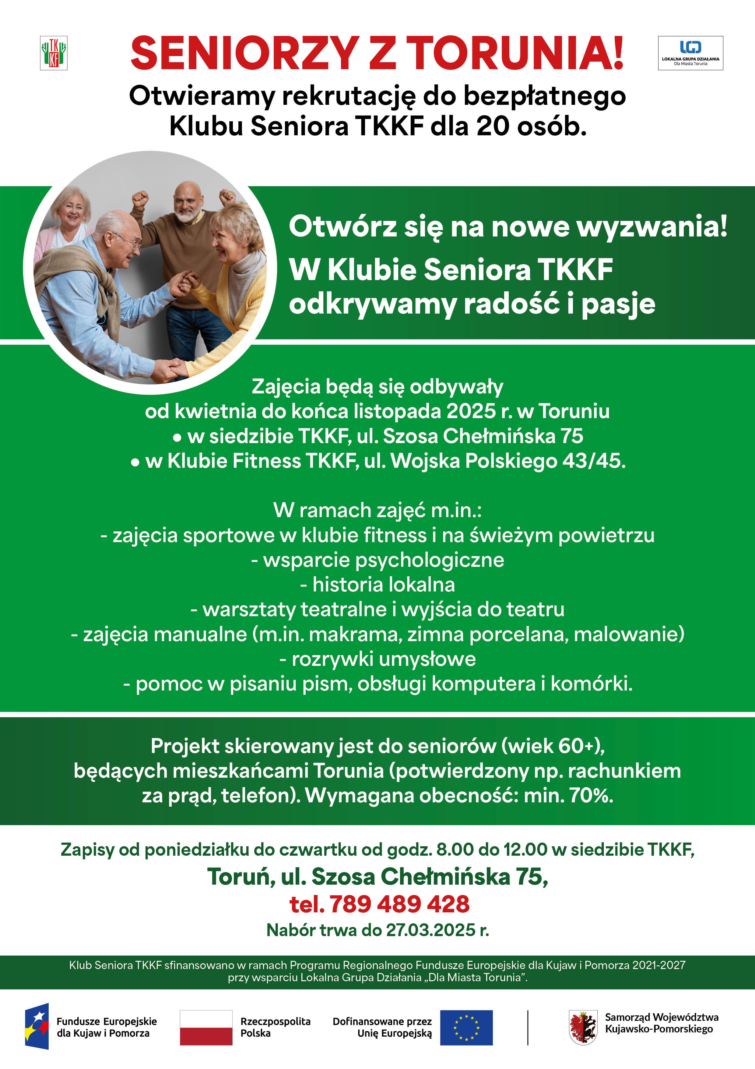 Klub Seniora TKKF sfinansowano w ramach Programu Regionalnego Fundusze Europejskie dla Kujaw i Pomorza 2021-2027 przy wsparciu Lokalna Grupa Działania "Dla Miasta Torunia".