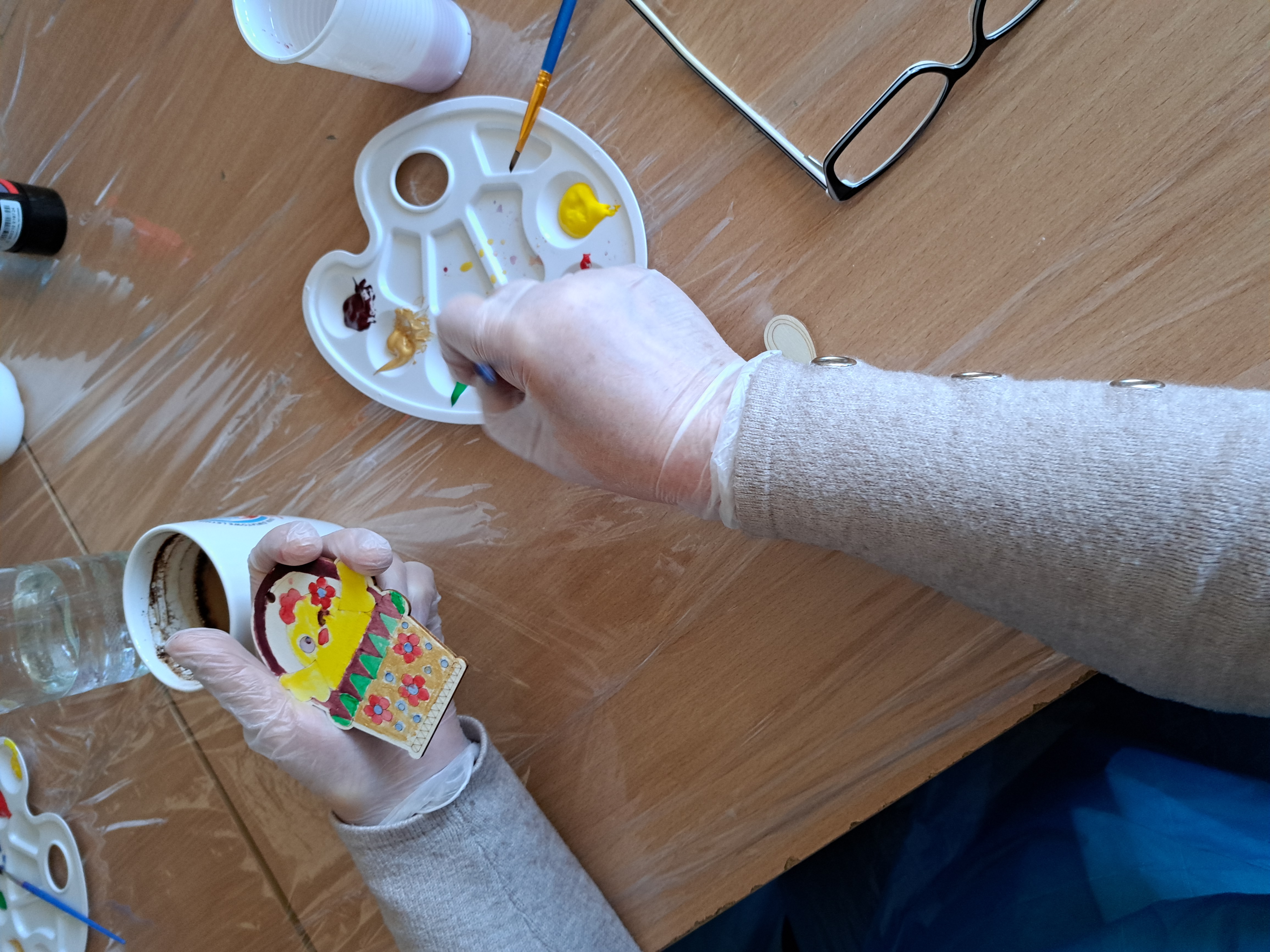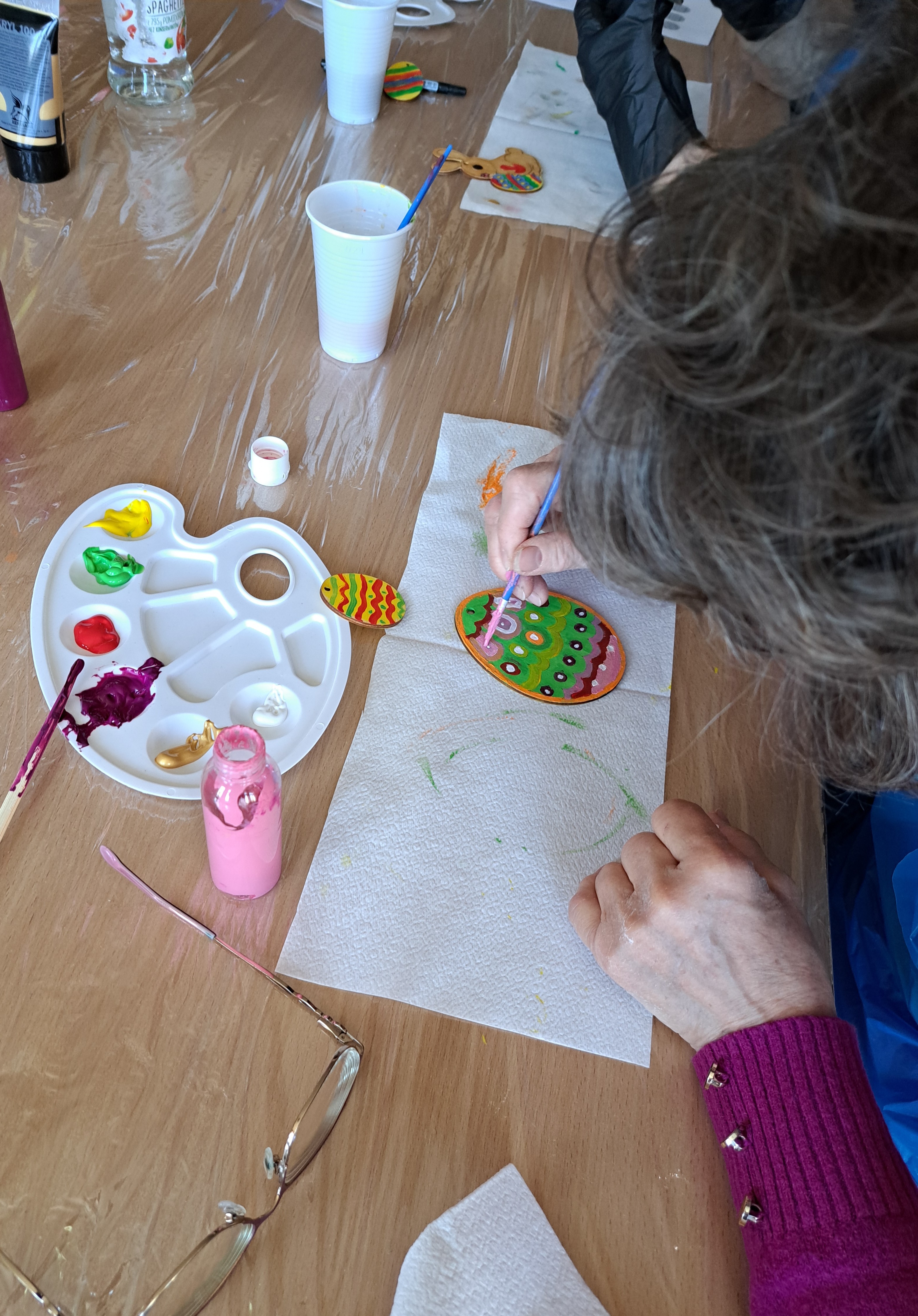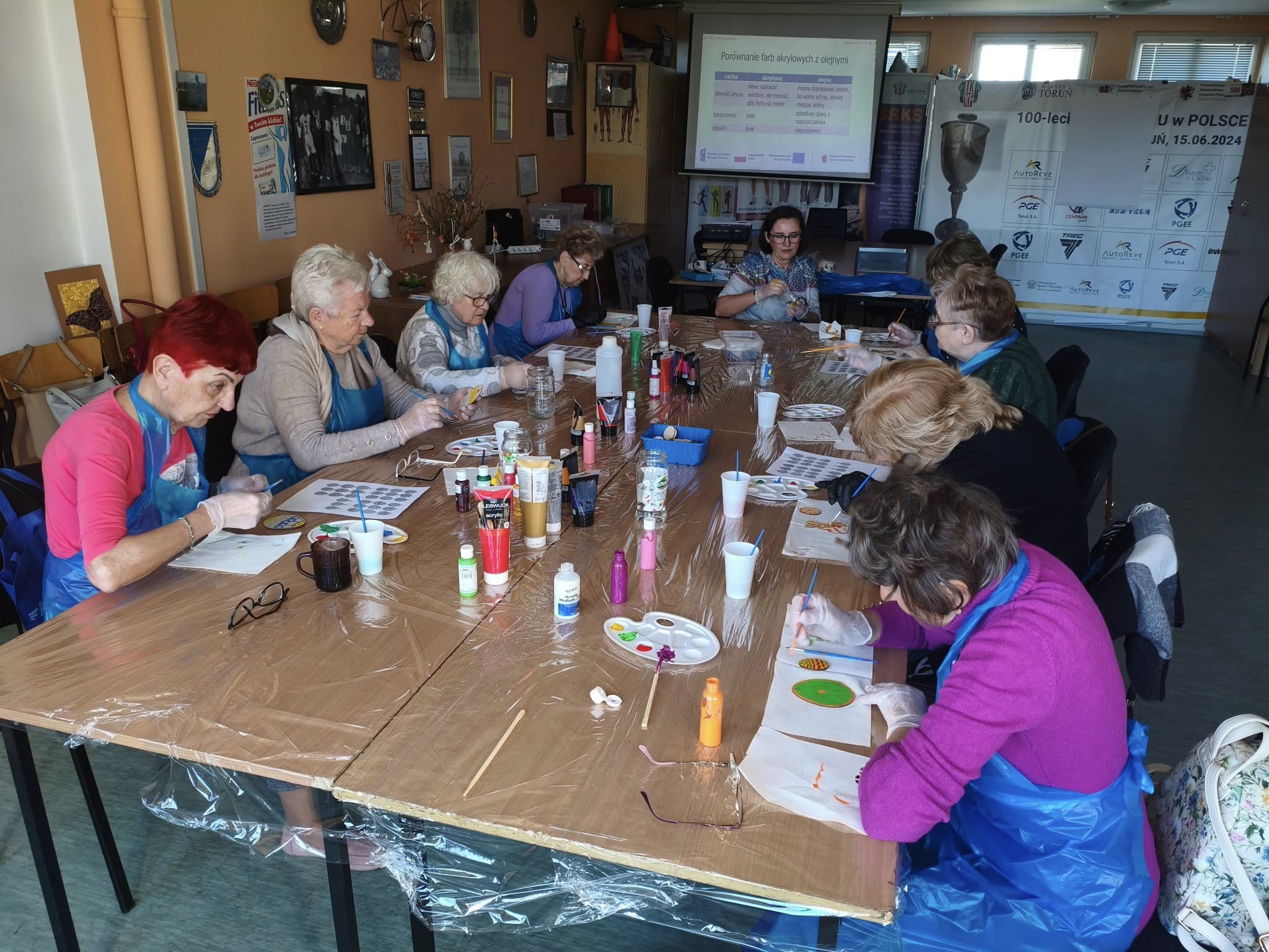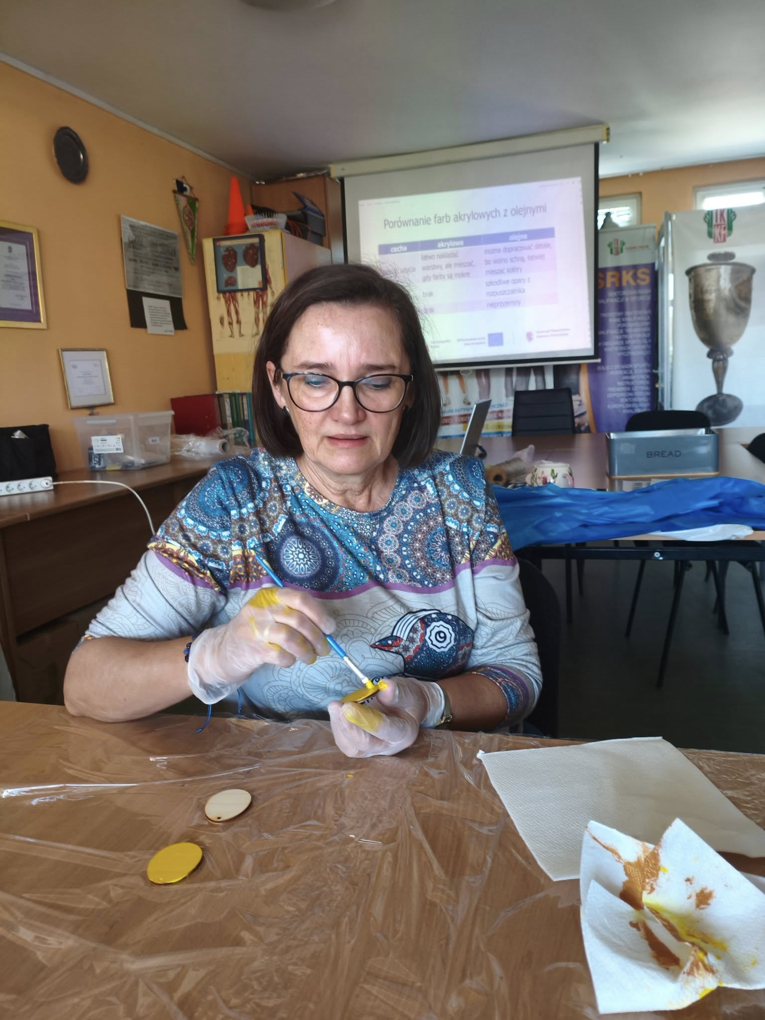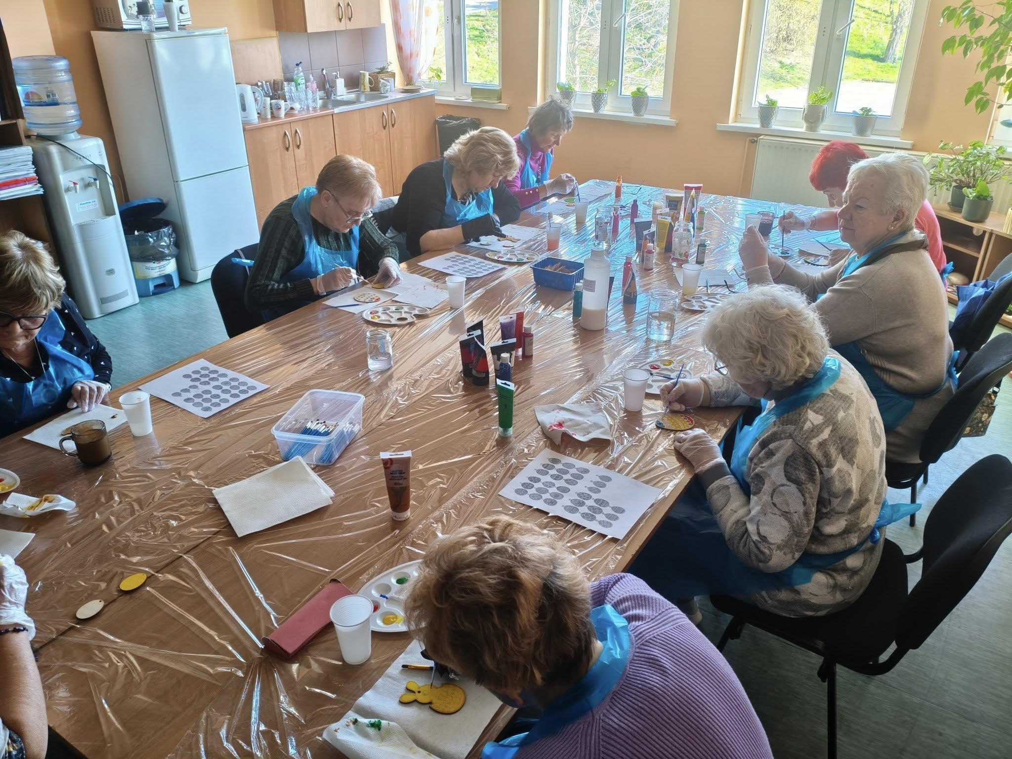 Panie malowały akrylami na sklejce z wzorami wielkanocnymi. Było trochę śmiechu, dużo skupienia, przynajmniej na początku, trochę stresu, który wkrótce uległ rozładowaniu, gdy okazało się, że malowanie akrylami jest łatwe i przyjemne.