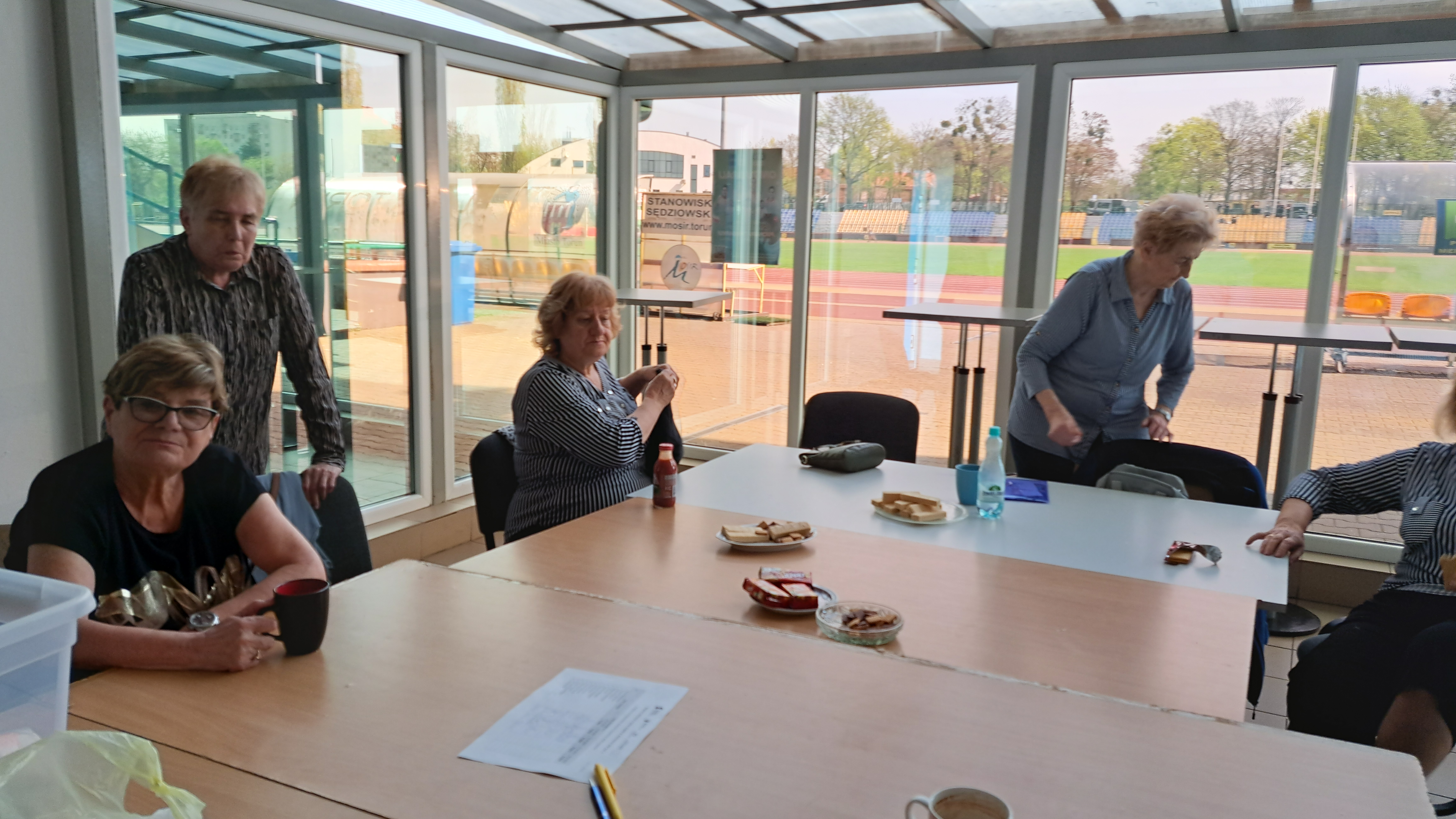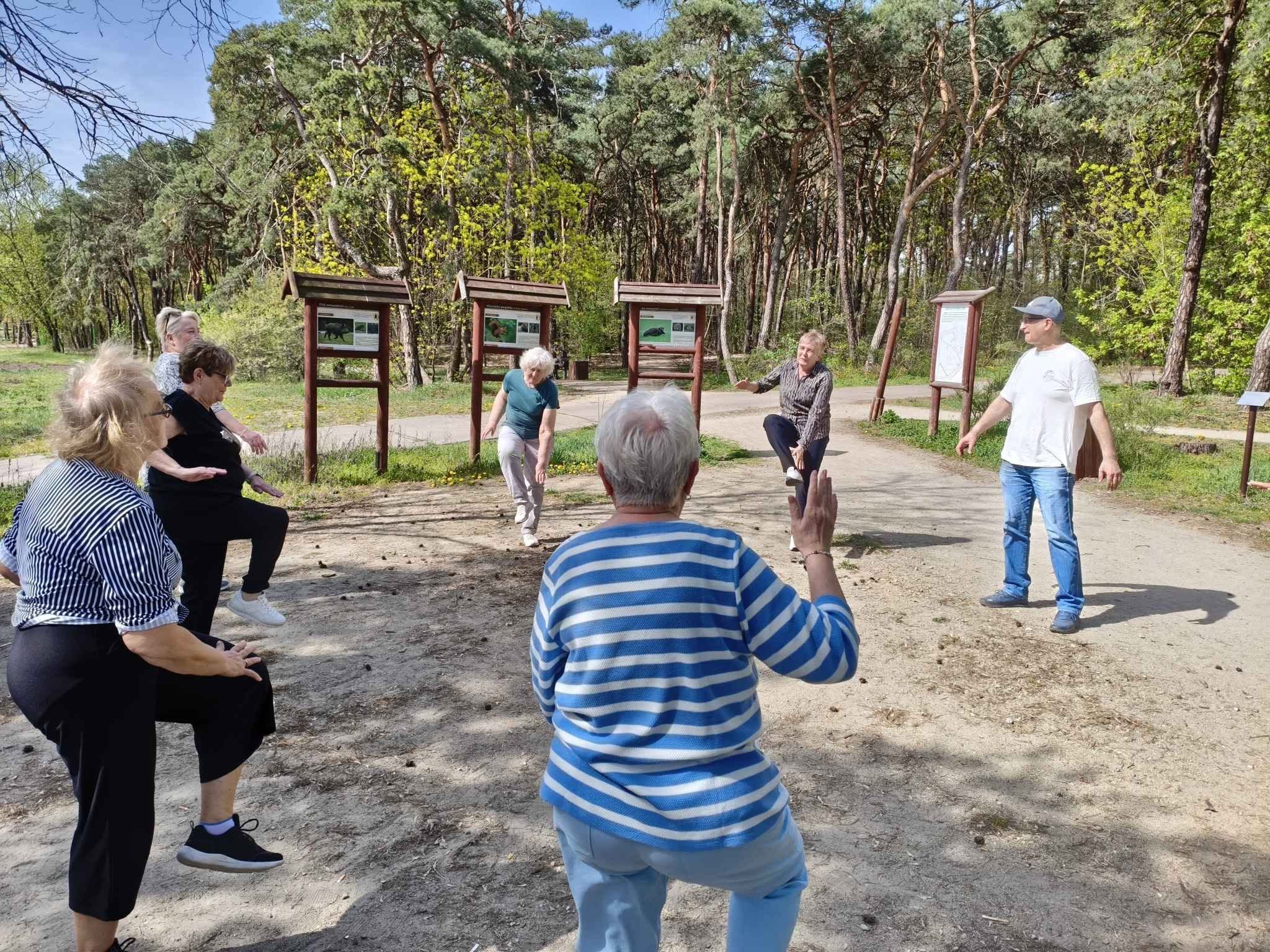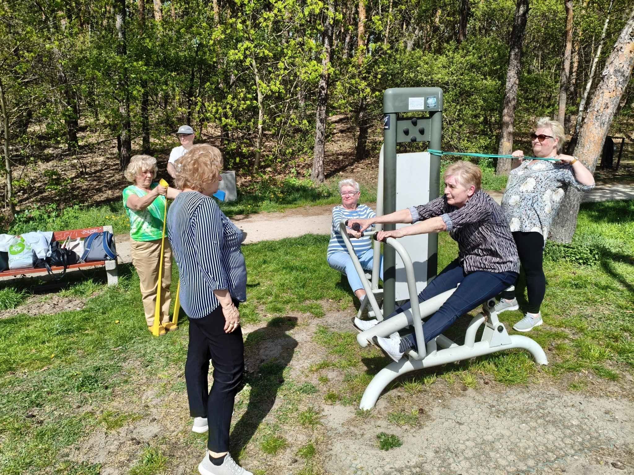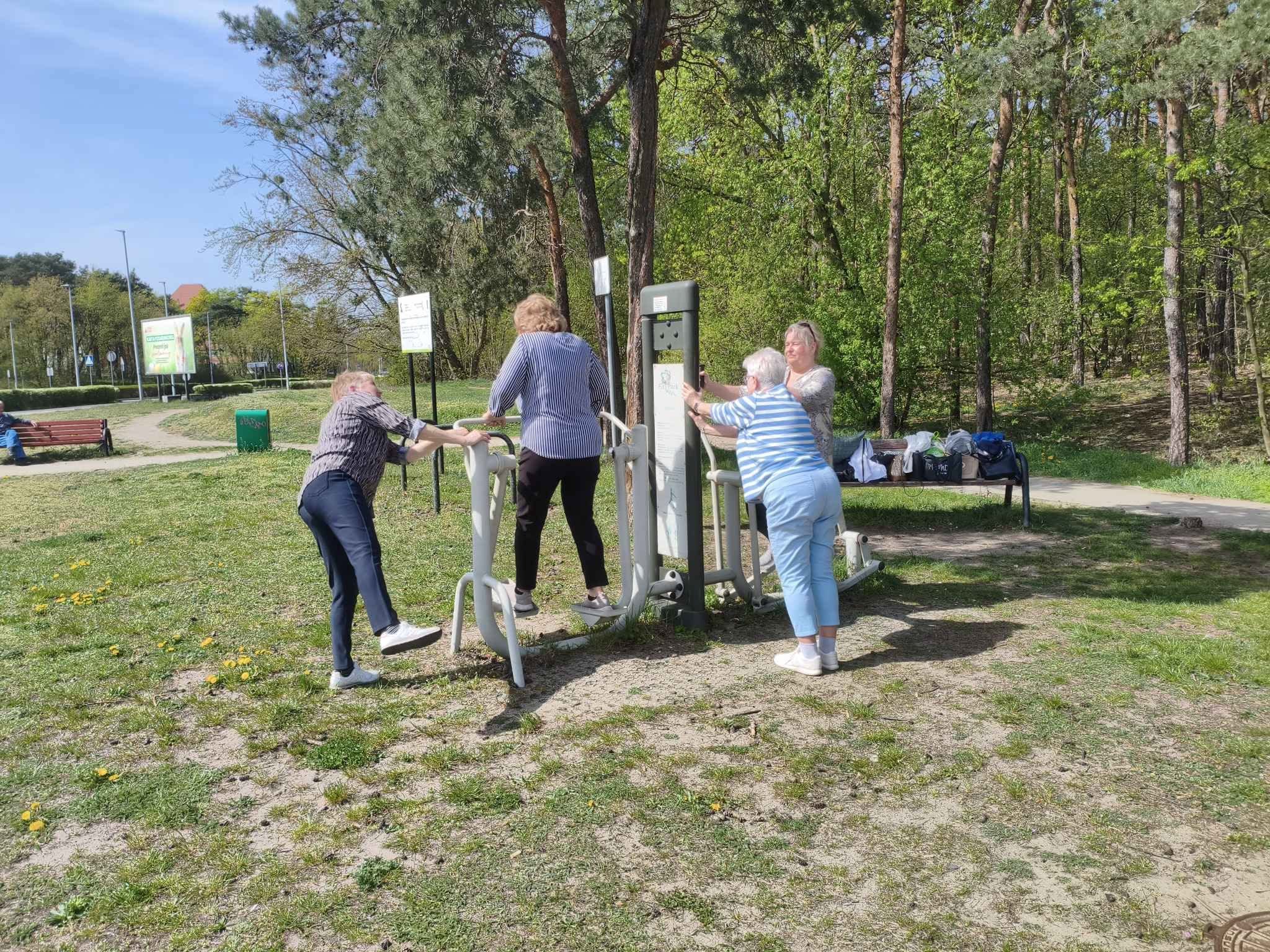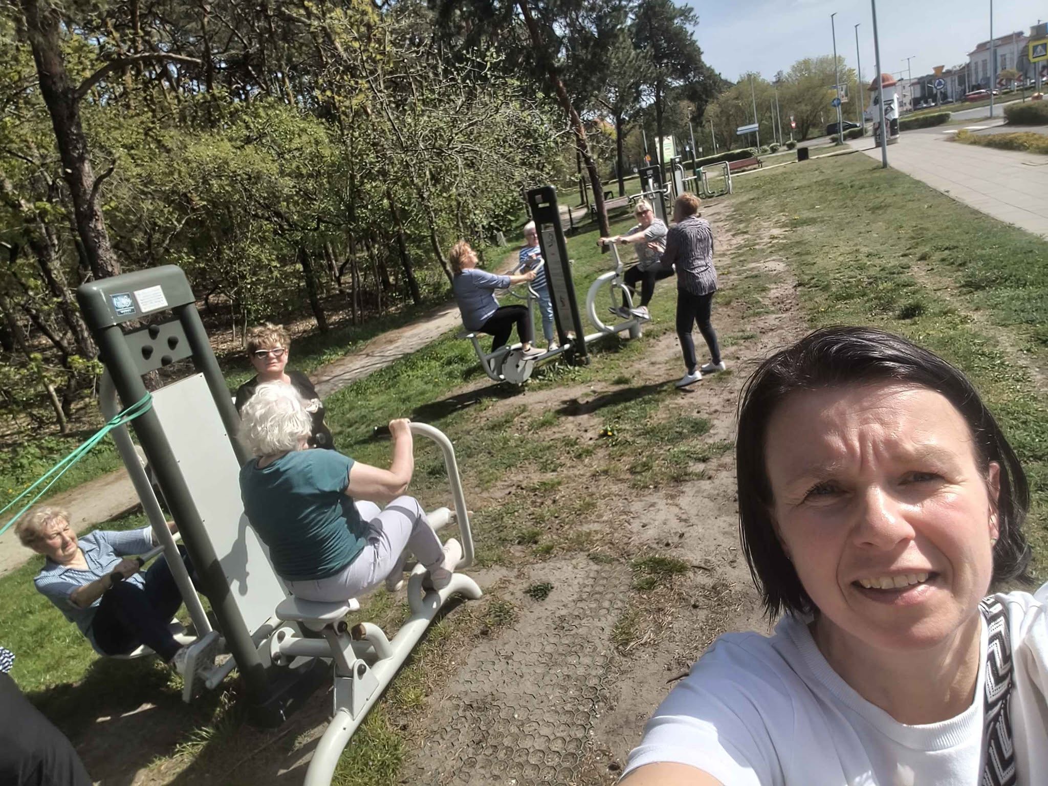 Potem Katarzyna zabrała już całą grupę na siłownię zewnętrzną na ul. Bema. Było aktywnie i wesoło aż panie nabrały chęci na mycie okien 🙂