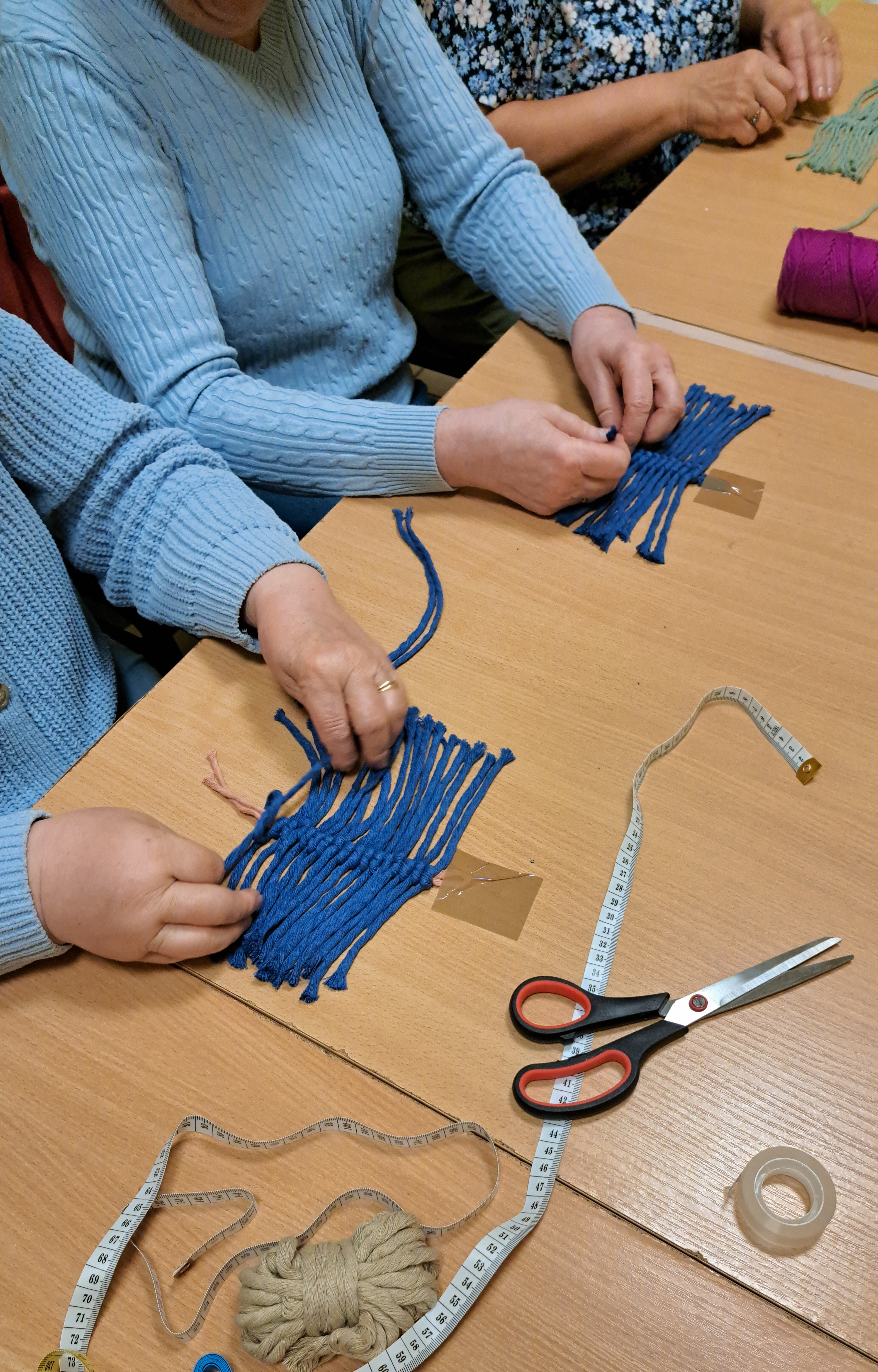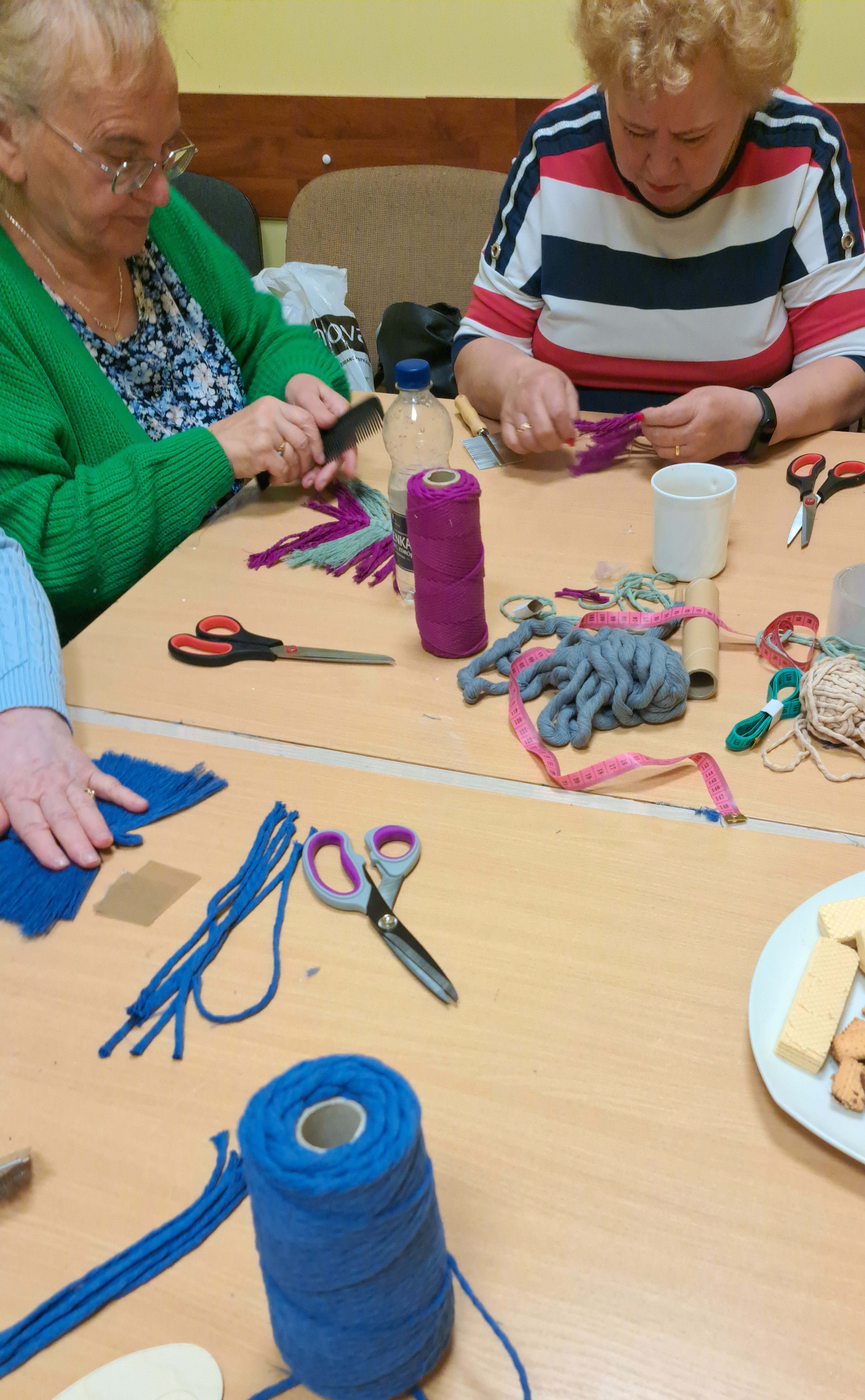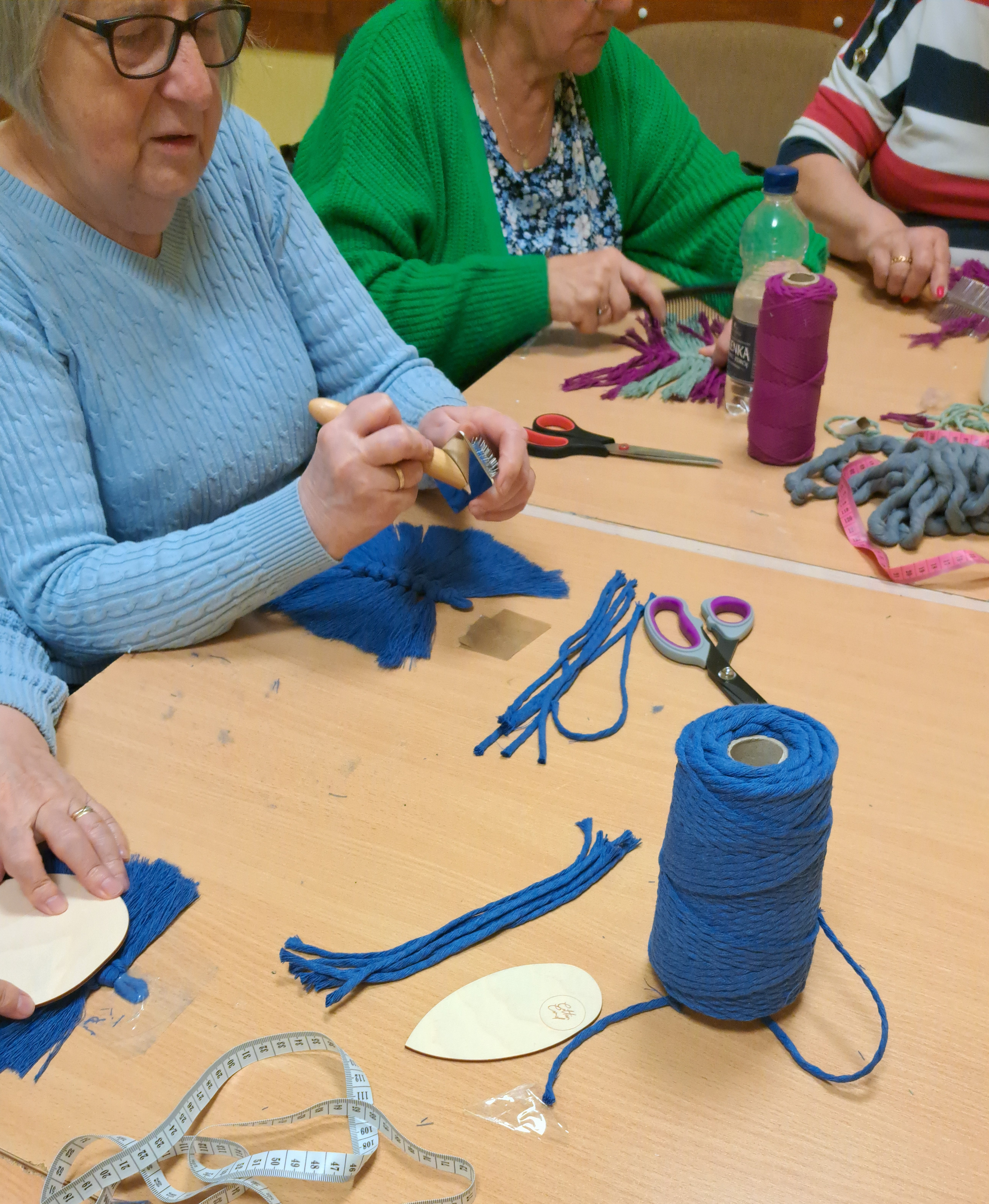 Od rana - zajęcia manualne z Anna. Dziś makrama i liść/pióro plecione ze sznurka skręcanego, potem wyczesywane, przycinane, usztywniane, znowu przycinane i gotowe.