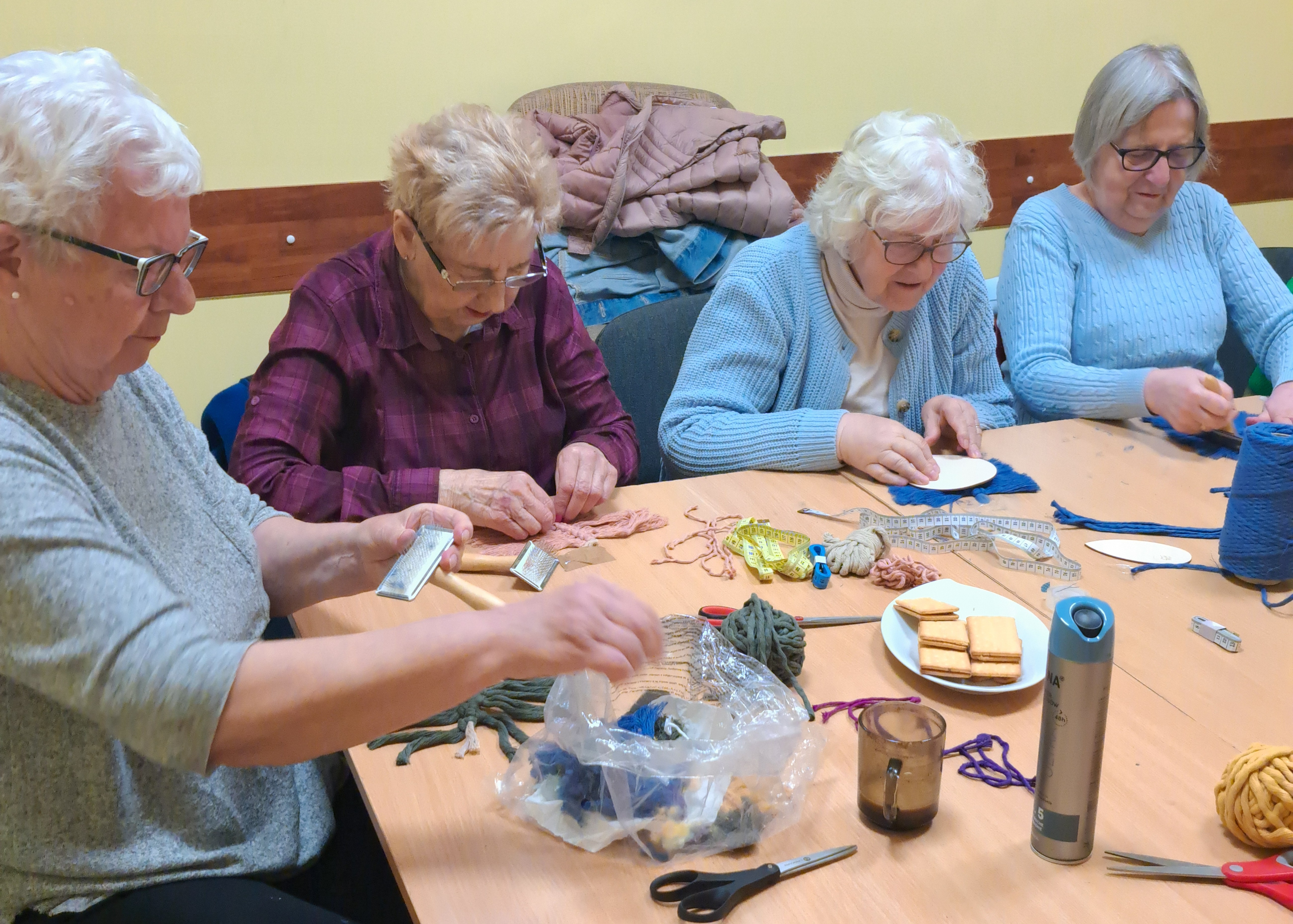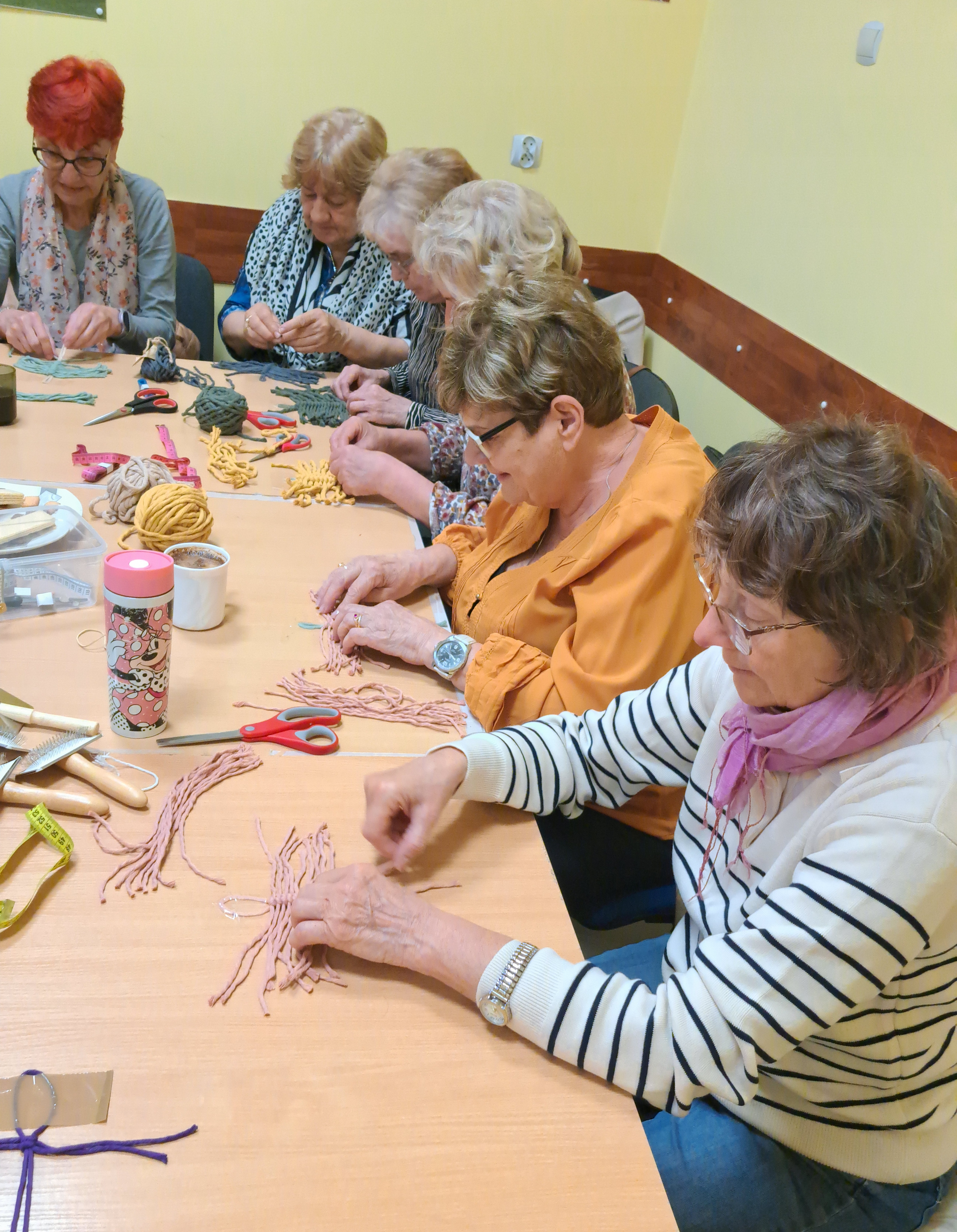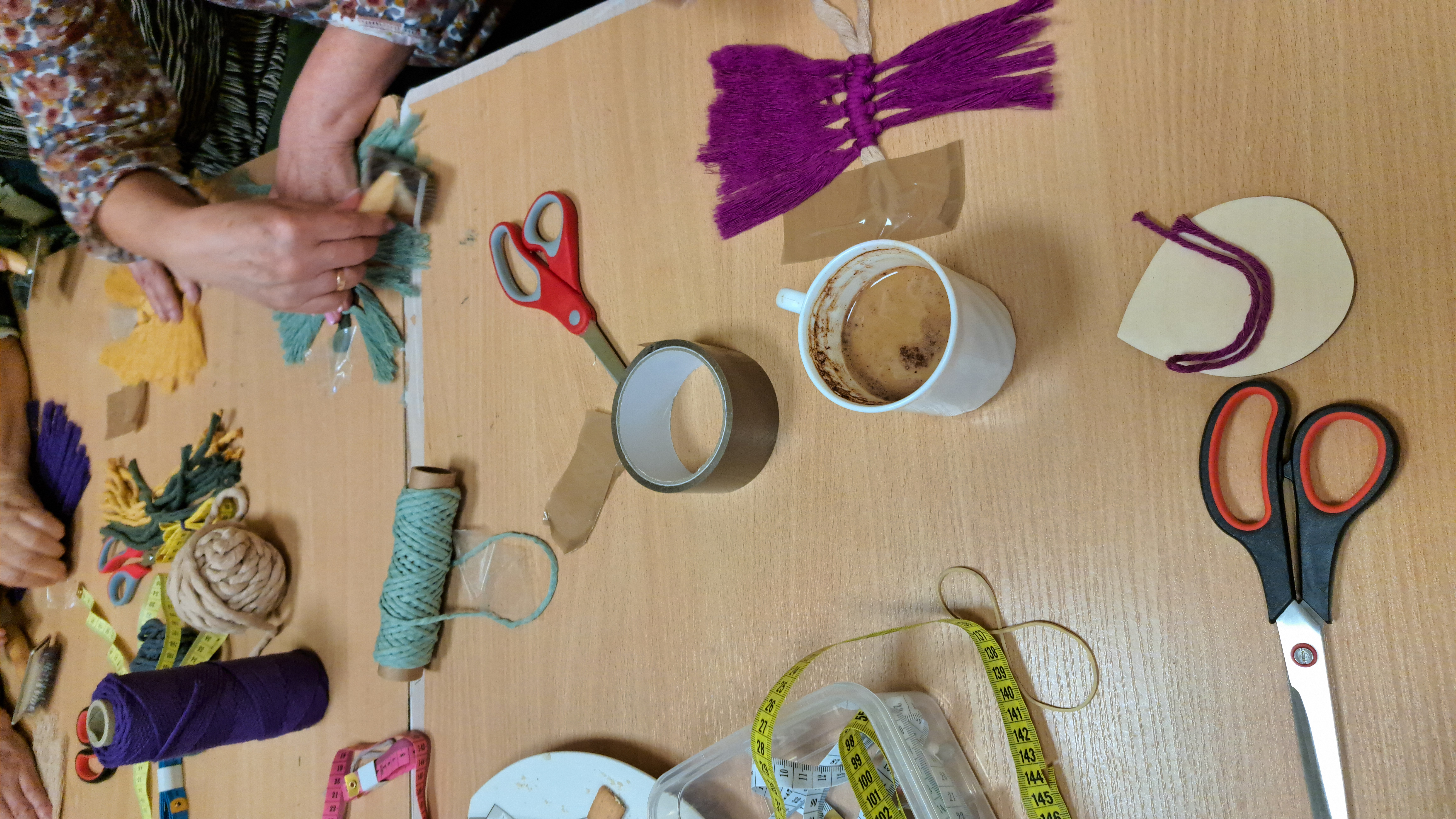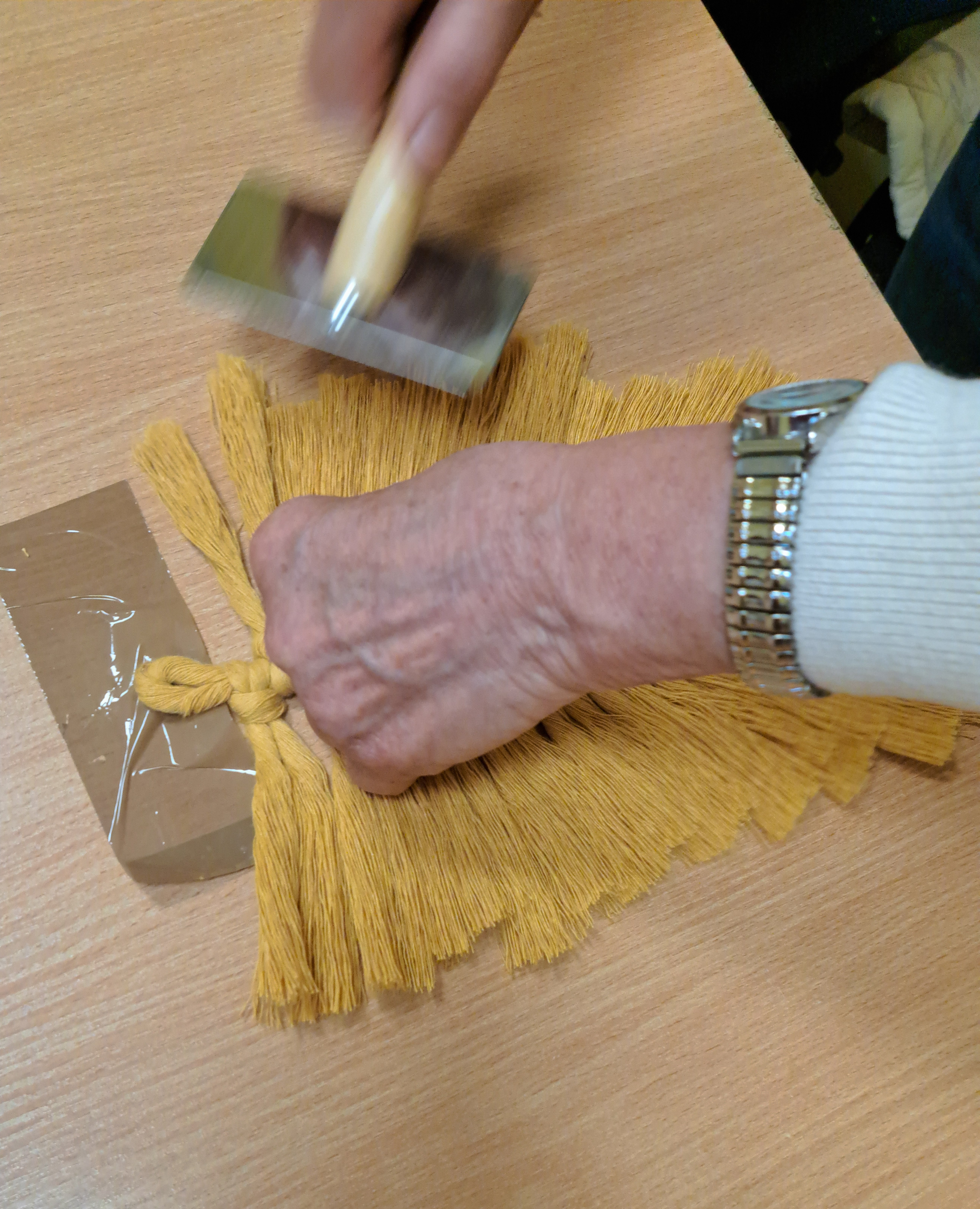 Od rana - zajęcia manualne z Anna. Dziś makrama i liść/pióro plecione ze sznurka skręcanego, potem wyczesywane, przycinane, usztywniane, znowu przycinane i gotowe.