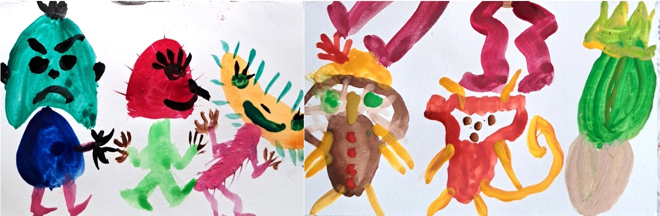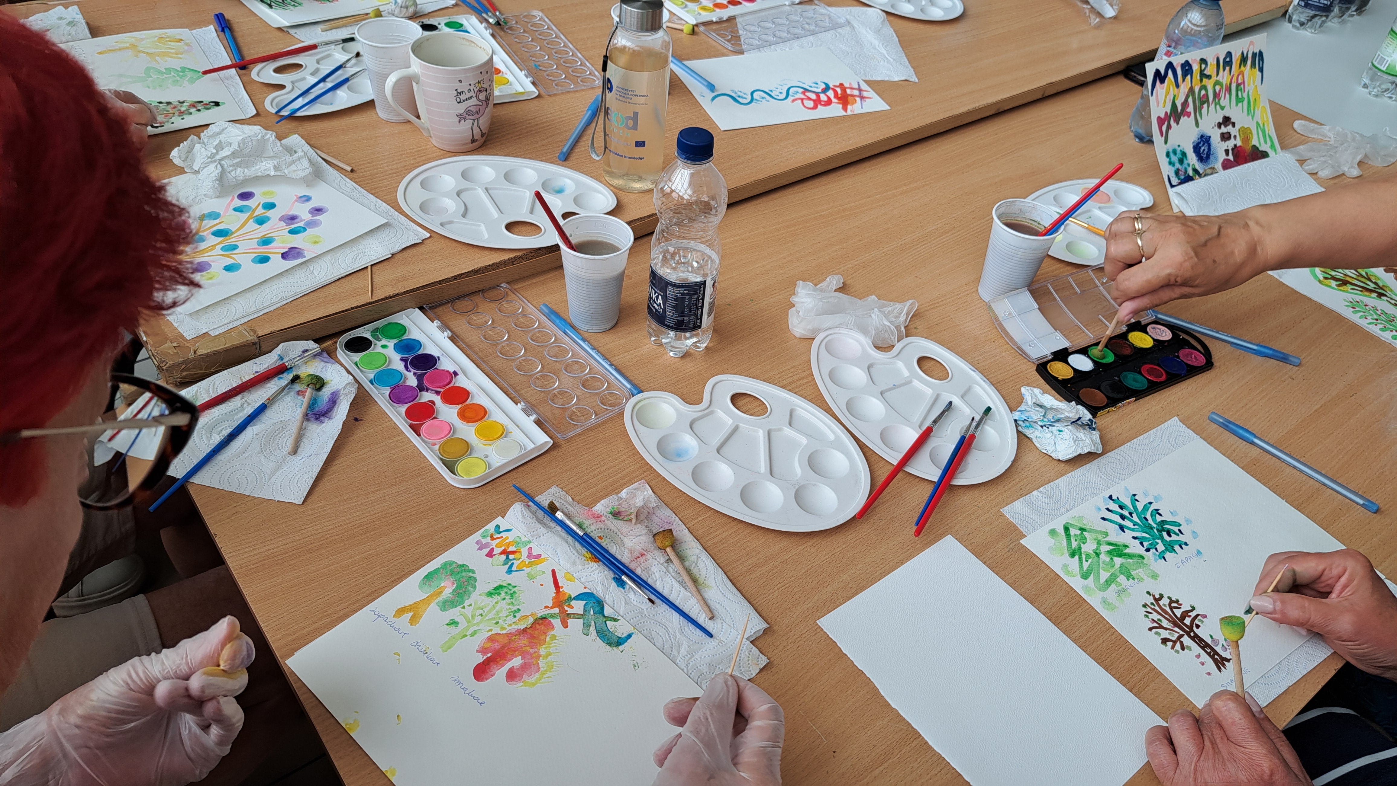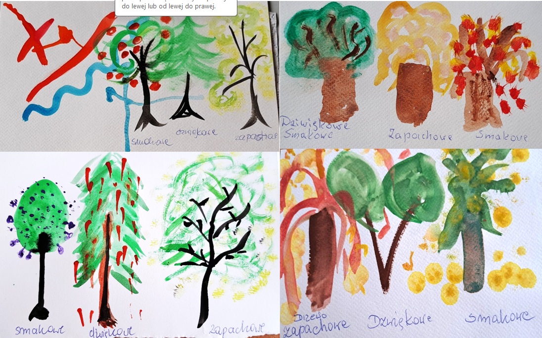 Ania zabrała nas do magicznego lasu, gdzie rosły zmysłowe drzewa, były dziwozwierze i gangi grzybowe. Stosowaliśmy poznane techniki akwarelowe i dobrze się bawiliśmy.