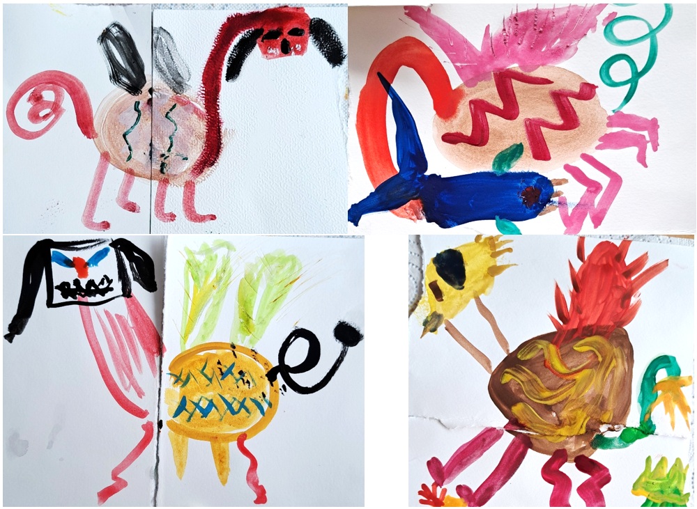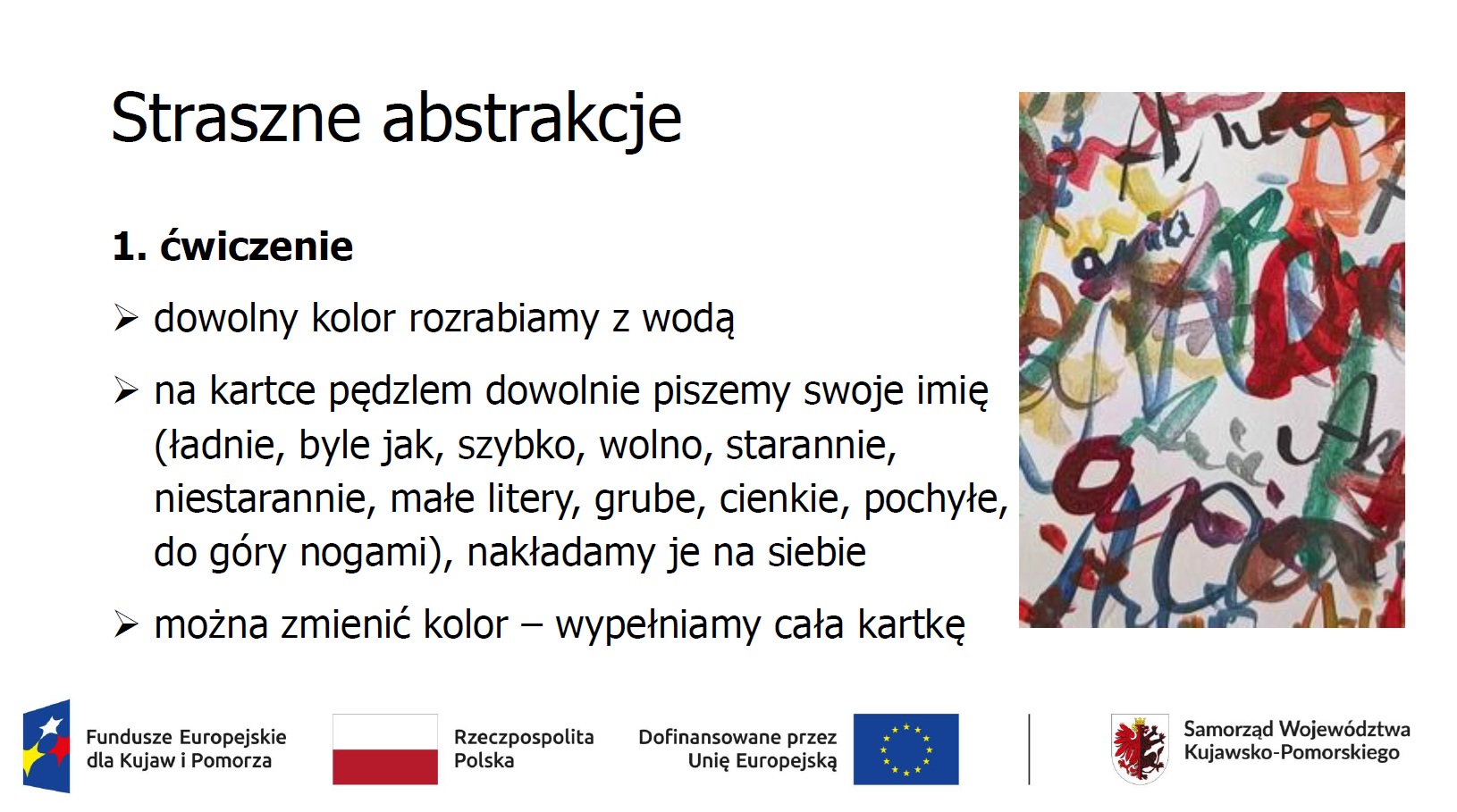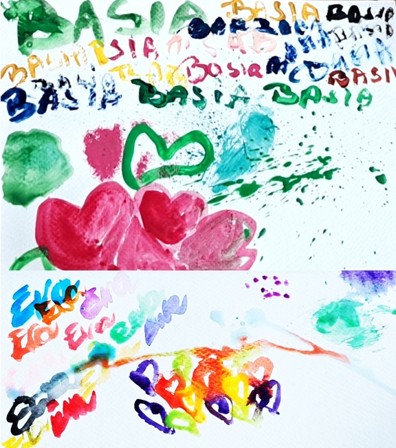 Potem mieliśmy zajęcia z kreatywności (grupa rękodzieło) i dalszy ciąg zabawy akwarelami. Na rozgrzewkę tworzyliśmy kompozycje ze swoich imion i wybranego elementu, np. serduszka.