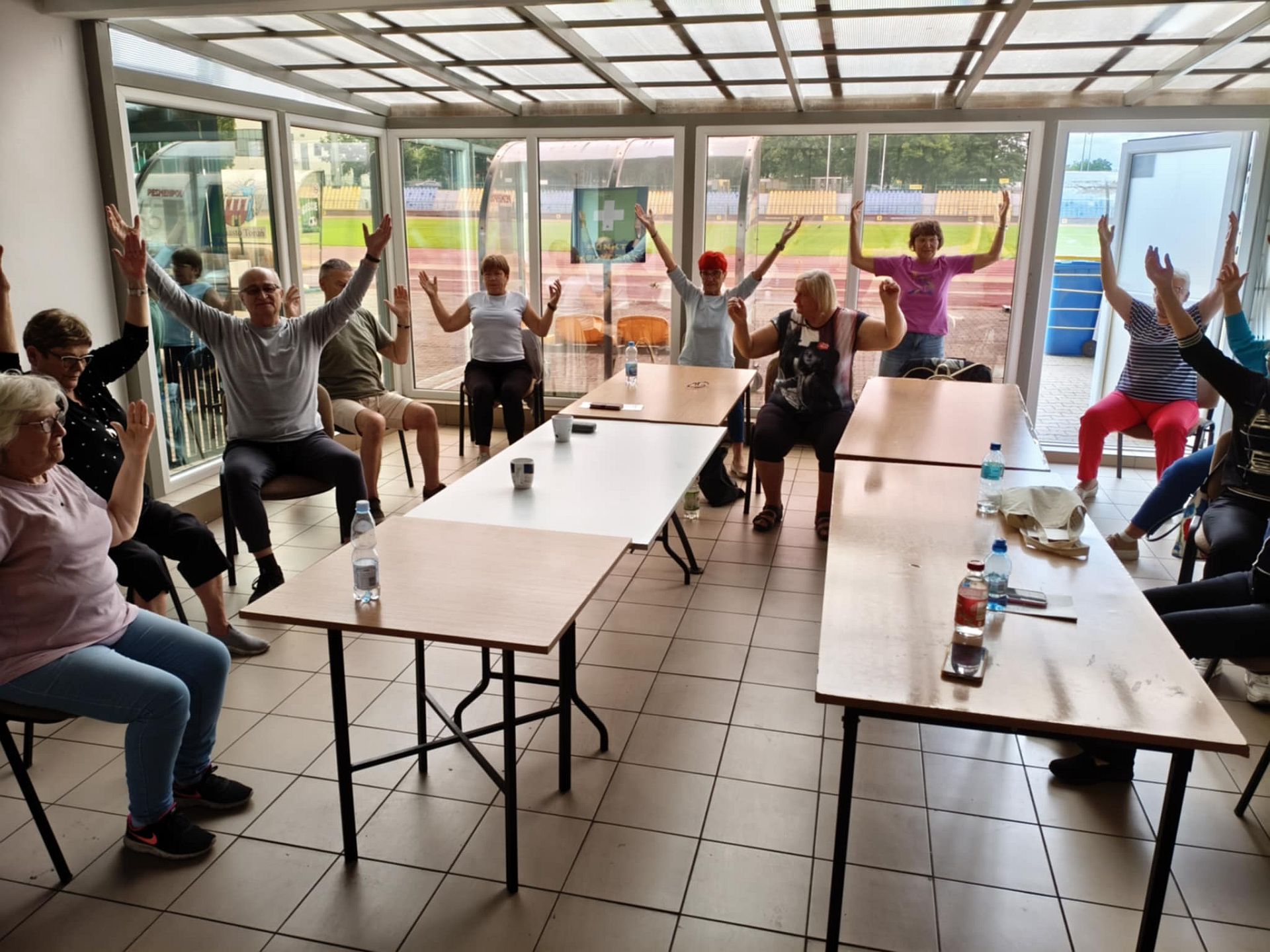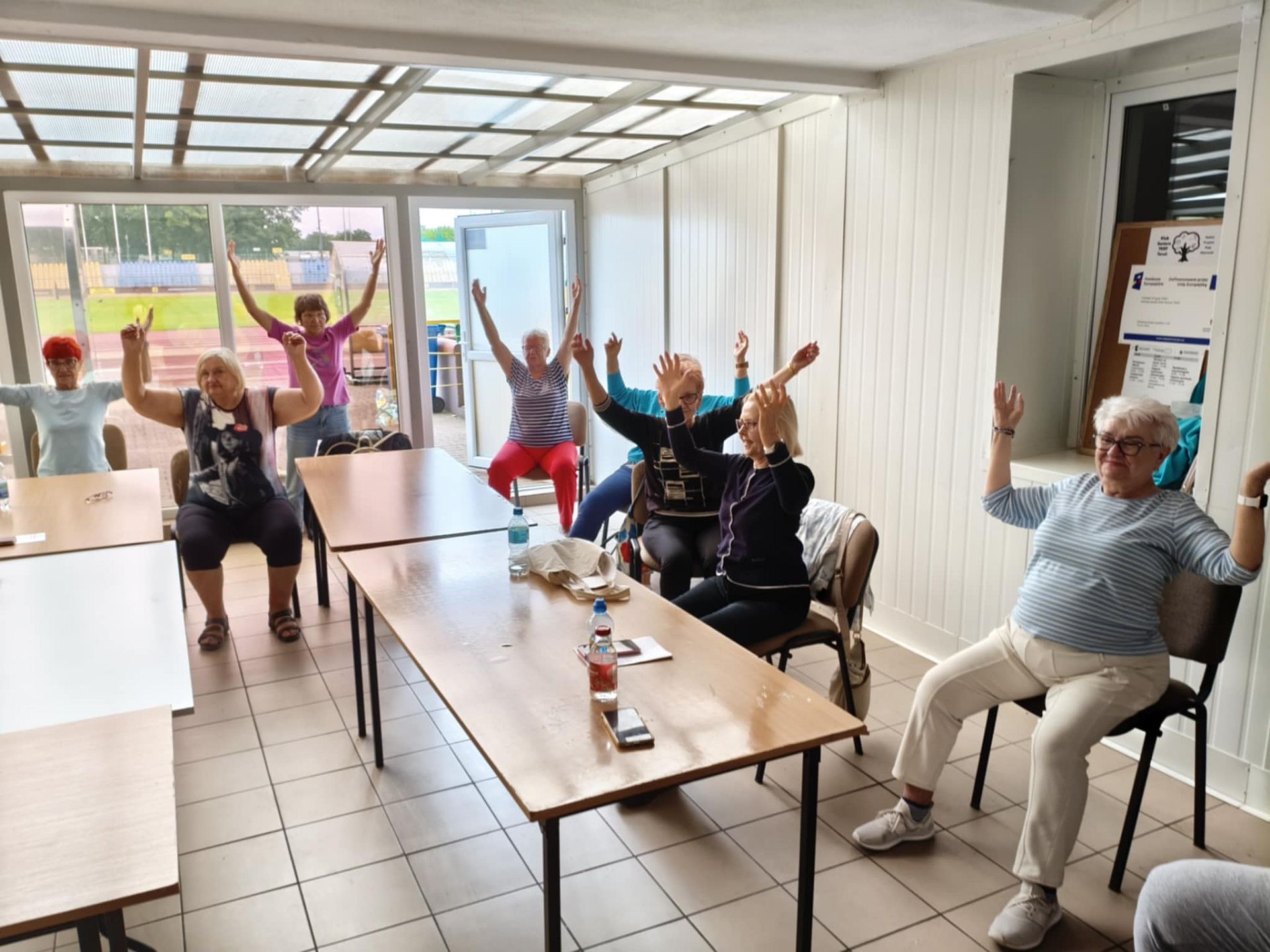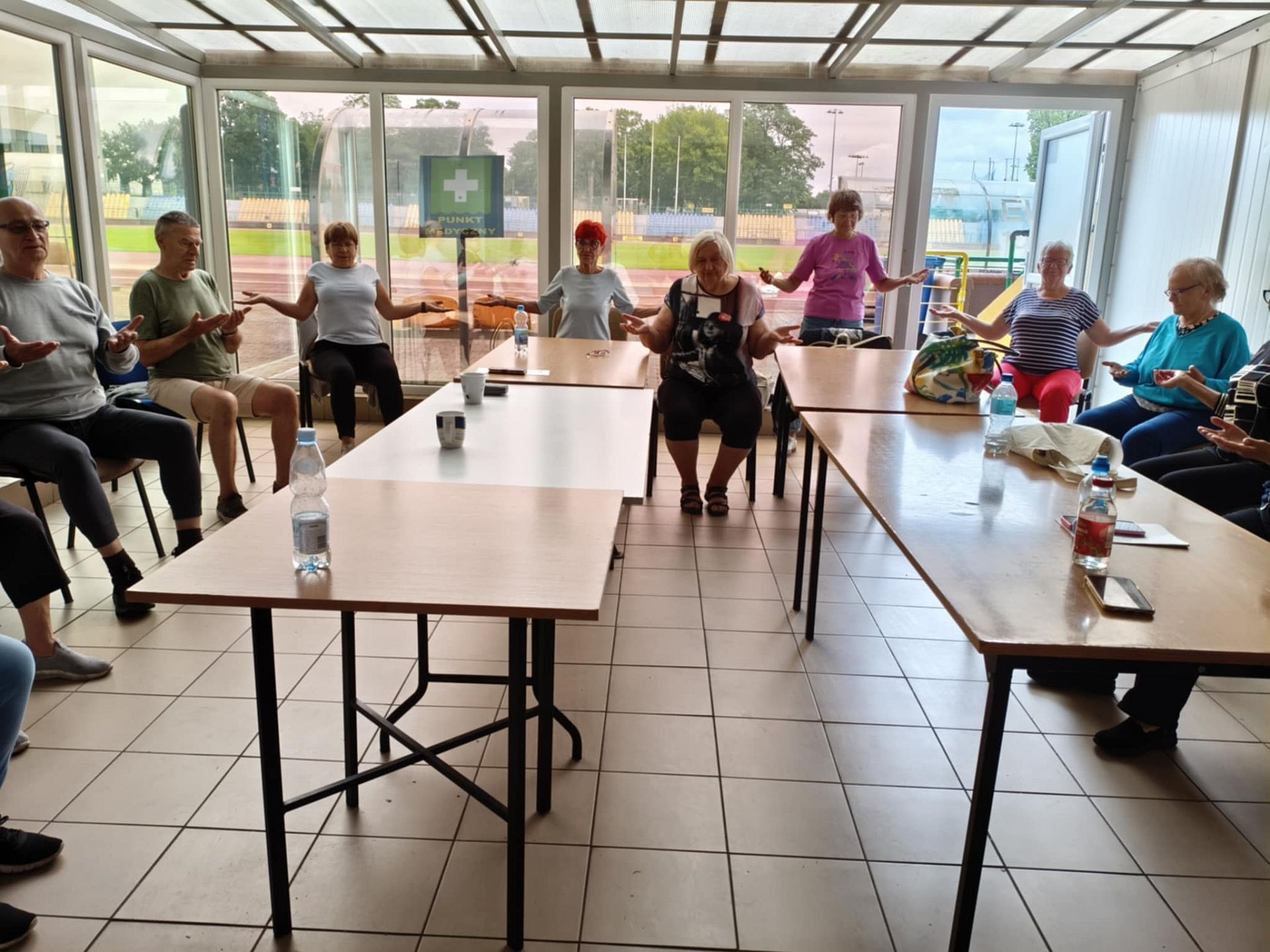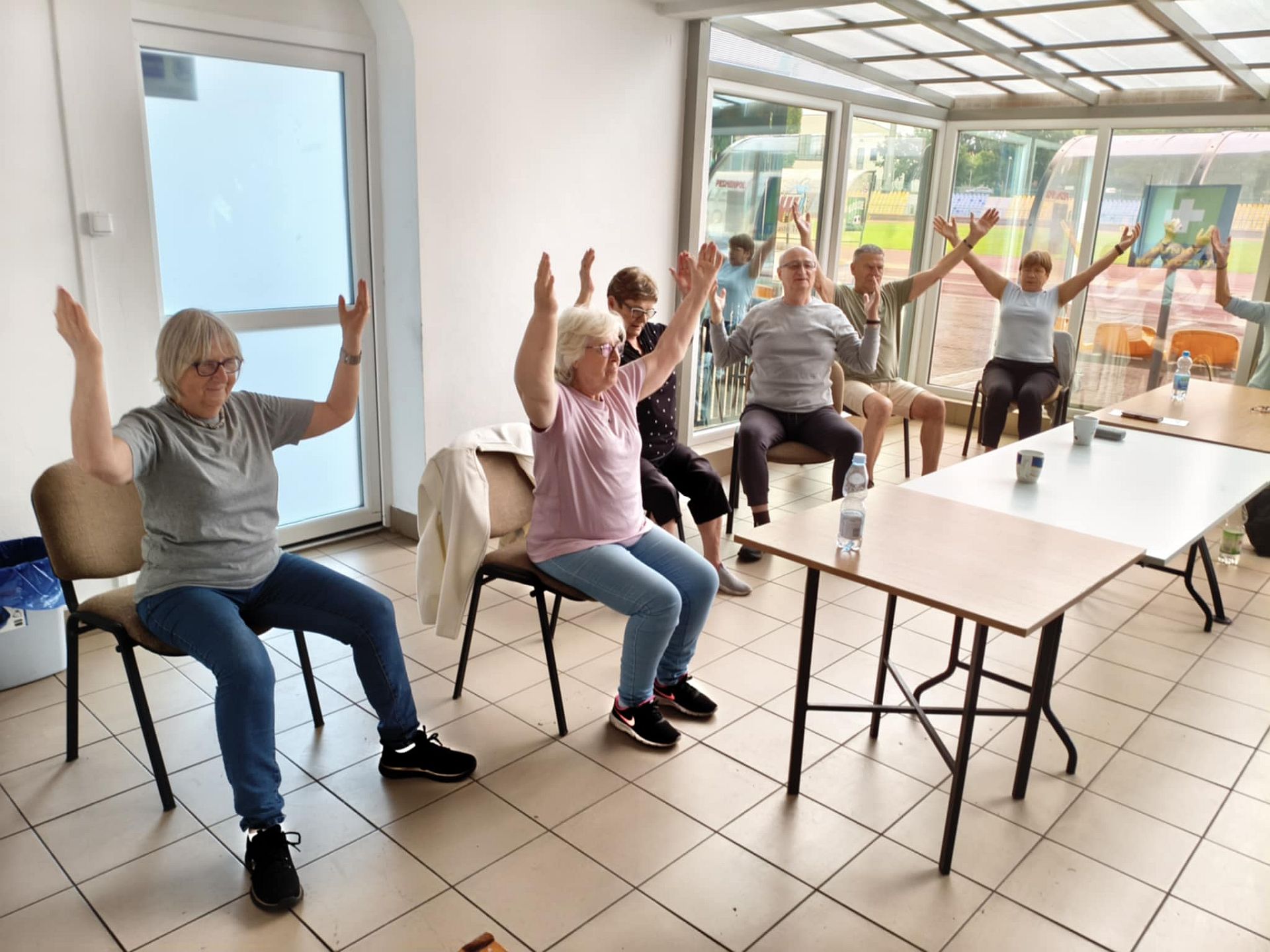 Z Kasią mieliśmy ćwiczenia jogowe na krzesłach, koordynacyjne oraz wzmacniające mięśnie stóp.