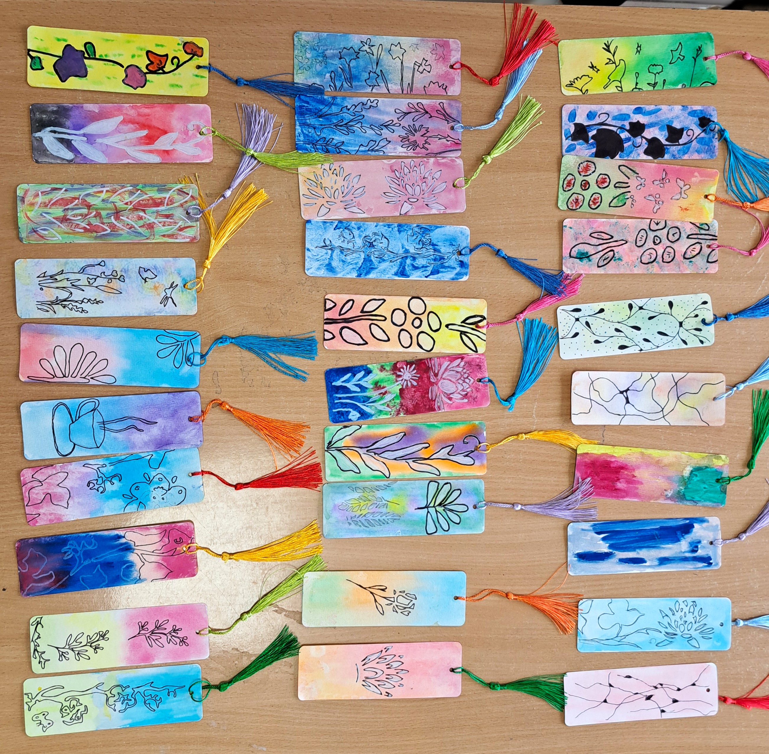 Tym razem, stosując poznane techniki mieszania farb, korzystając z gąbki, ręcznika papierowego, szablonów i markerów, robiliśmy dwustronne zakładki z chwostami do książek. Można je jeszcze zalaminować, żeby dłużej zachowały kształt, wzór i kształt.